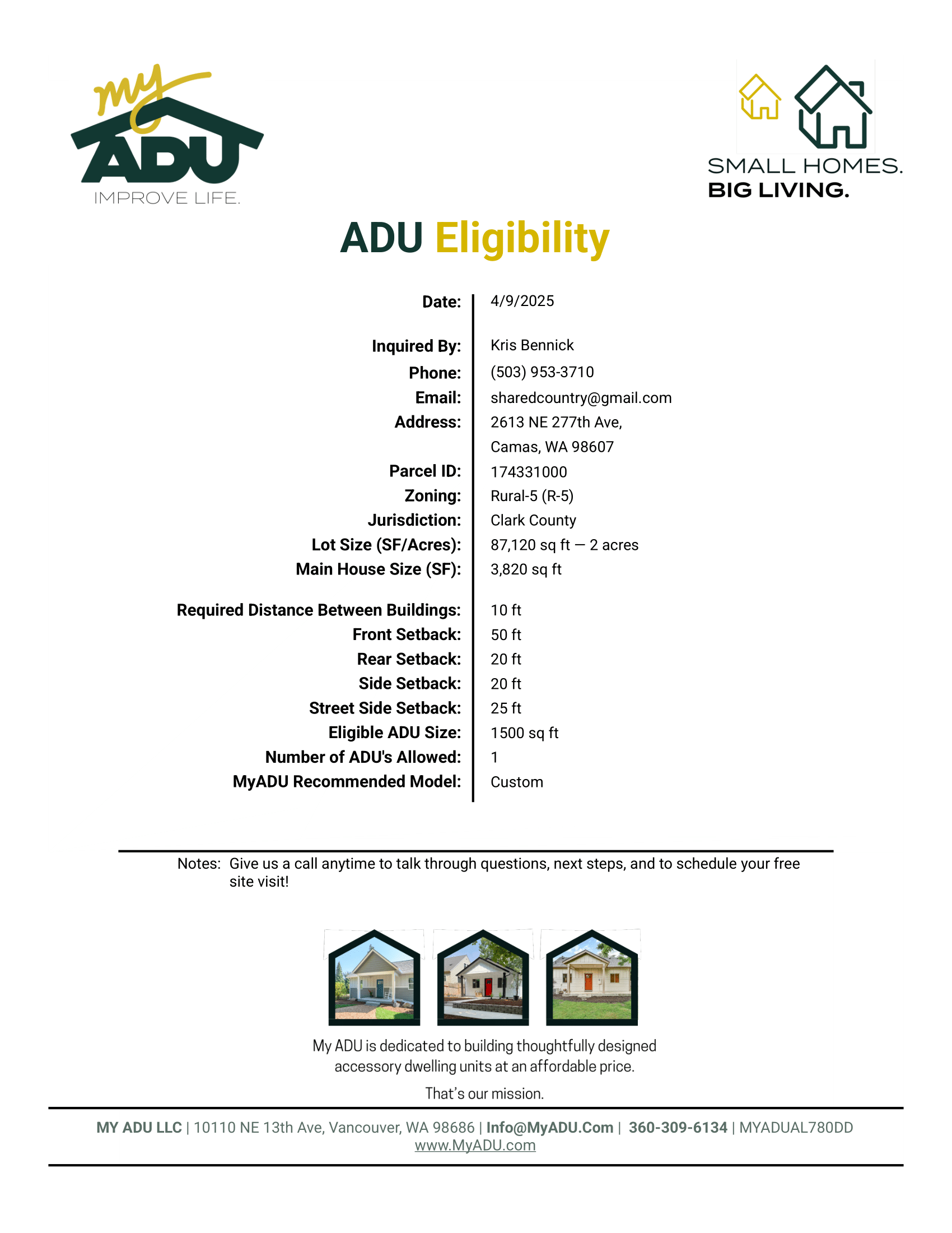 As of May 2025, Clark County, Washington, has implemented several changes to permitting rules for Accessory Dwelling Units (ADUs), Rural Accessory Dwelling Units (RADUs), tiny homes, and guest homes in unincorporated areas zoned R-5. These changes aim to increase housing options while maintaining rural character. (ADU code changes approved, Section 40.260.022)